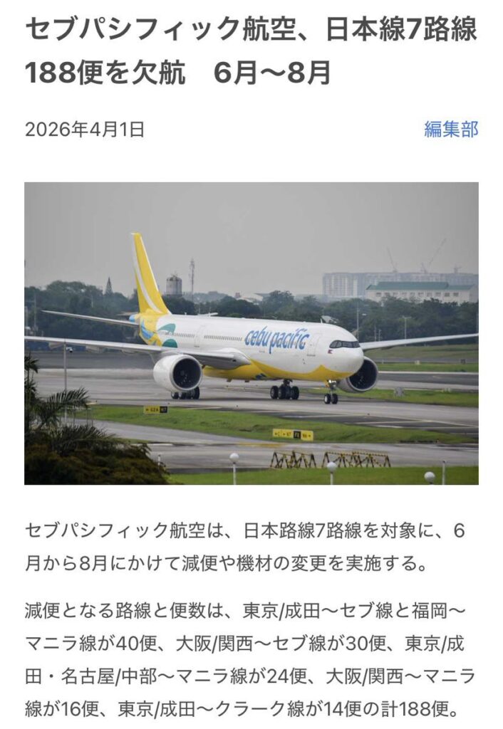 カテゴリー フィリピン関係の投稿 セブパシフィック航空が減便! 投稿者 作成者: showada 投稿日 2026年4月2日 セブパシフィック航空が減便! へのコメントはまだありません 記事には6月から8月と書いてありますが 9月ぐらいまで減便しています みなさま高騰しているので早めにお買い求めを! ← お得な海外保険 コメントを残す コメントをキャンセルメールアドレスが公開されることはありません。 ※ が付いている欄は必須項目ですコメント ※ 名前 メール サイト 次回のコメントで使用するためブラウザーに自分の名前、メールアドレス、サイトを保存する。
